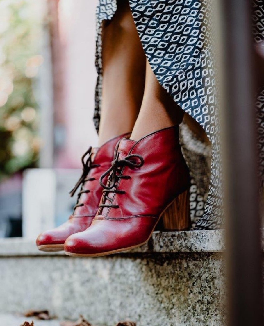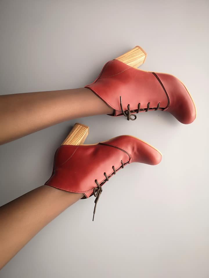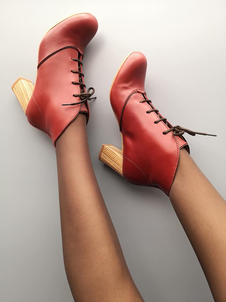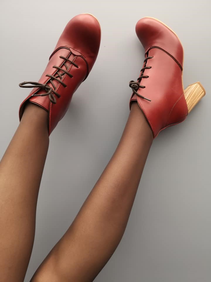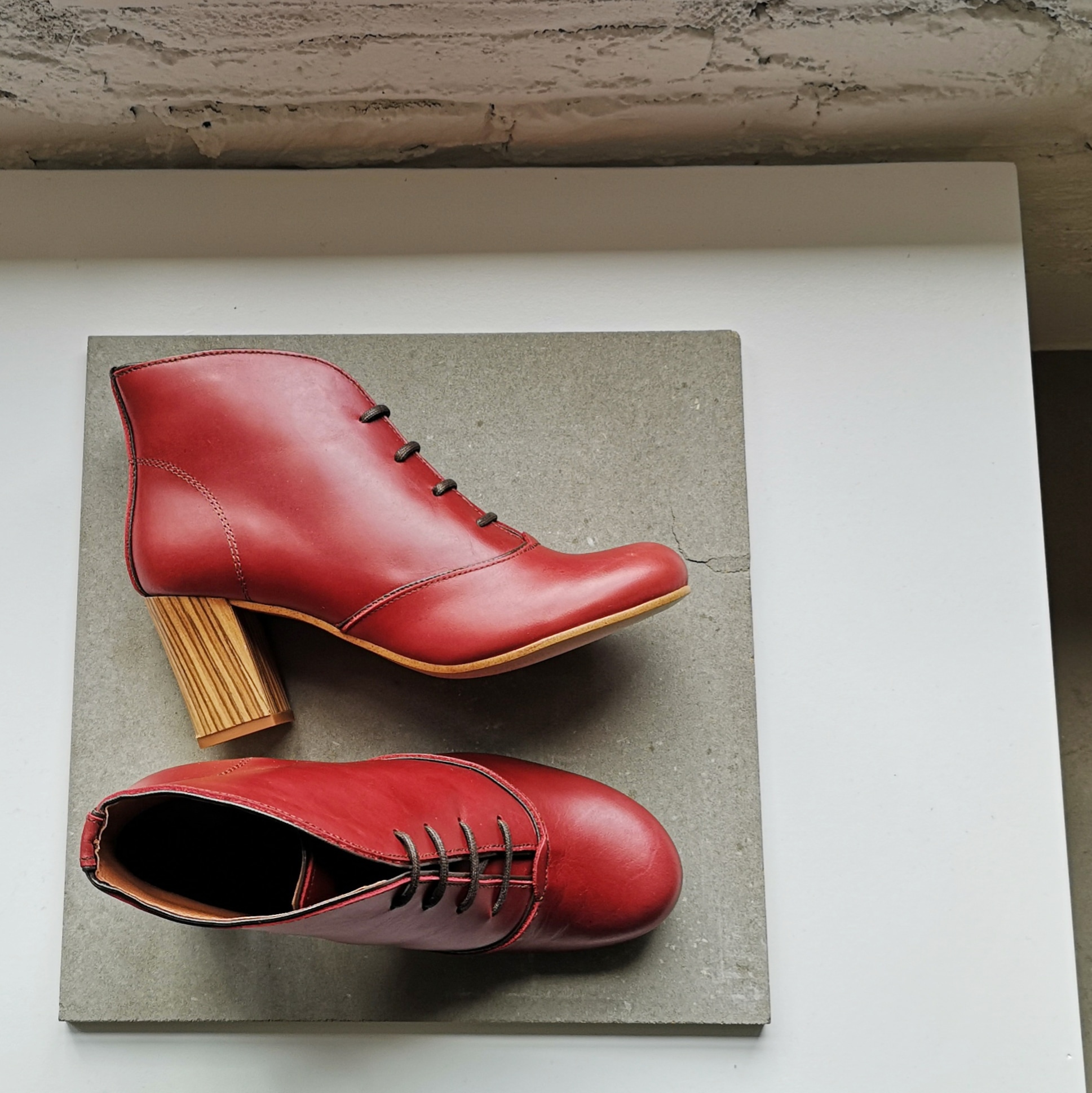 El modelo CERISE está elaborado artesanalmente en España con una suave piel color cereza. Super cómodo para aguantar todo el día (y noche!), gracias a la estudiada forma e inclinación de su horma (para mayor comodidad de la espalda), y a su ancho tacón de 6,5 cm altura. Cierre mediante cordones color marrón oscuro.