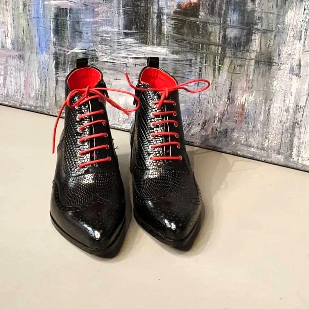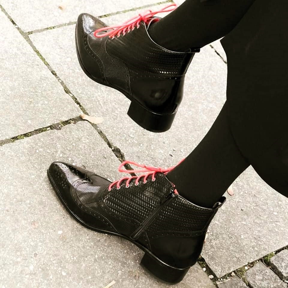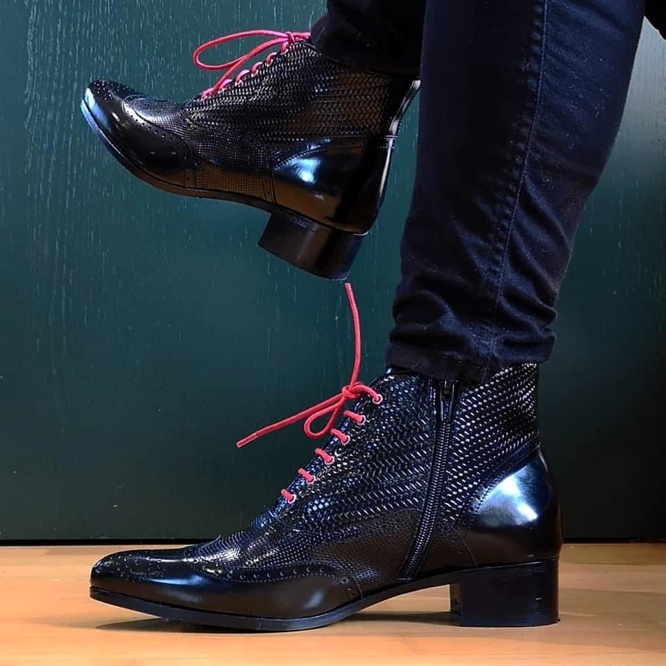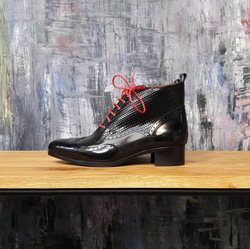 El modelo DARK es un botín acordonado, elaborado artesanalmente en España con una hermosa piel florentic color negro grabada, que se caracteriza por su cuerpo, resistencia y lustre duraderos. Cierre mediante cordones y cremallera lateral, para mayor facilidad de calce. Viene con dos juegos de cordones: uno en color negro y otro en rojo, para combinar según se prefiera.