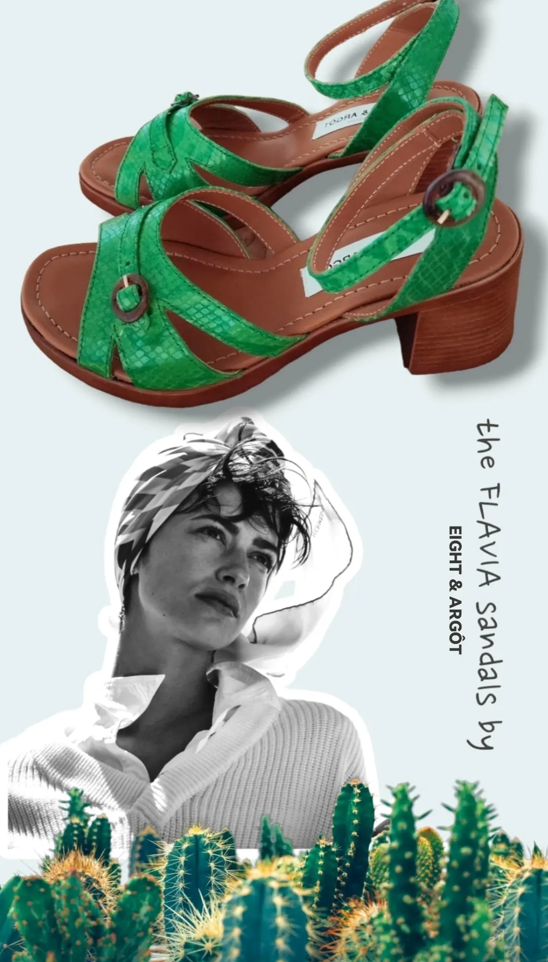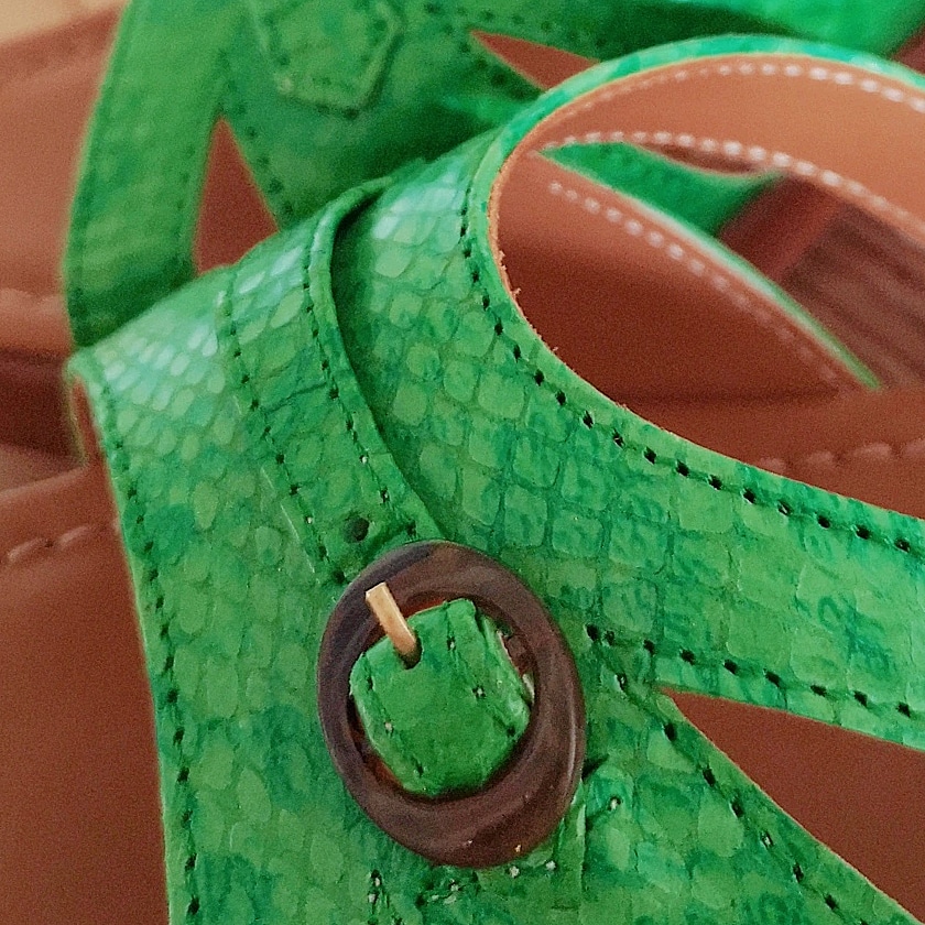 El modelo FLAVIA está elaborado artesanalmente en España con piel verde efecto pitón. Su silueta dibuja un tacón ancho de altura media, con una sutil plataforma que le suma centímetros y comodidad. Favorecedora pulsera fina de piel, cruzada por el talón para garantizar una mejor sujeción y adaptabilidad a diferentes anchuras de tobillos. Cierre con hebilla estilo carey y broche regulable.