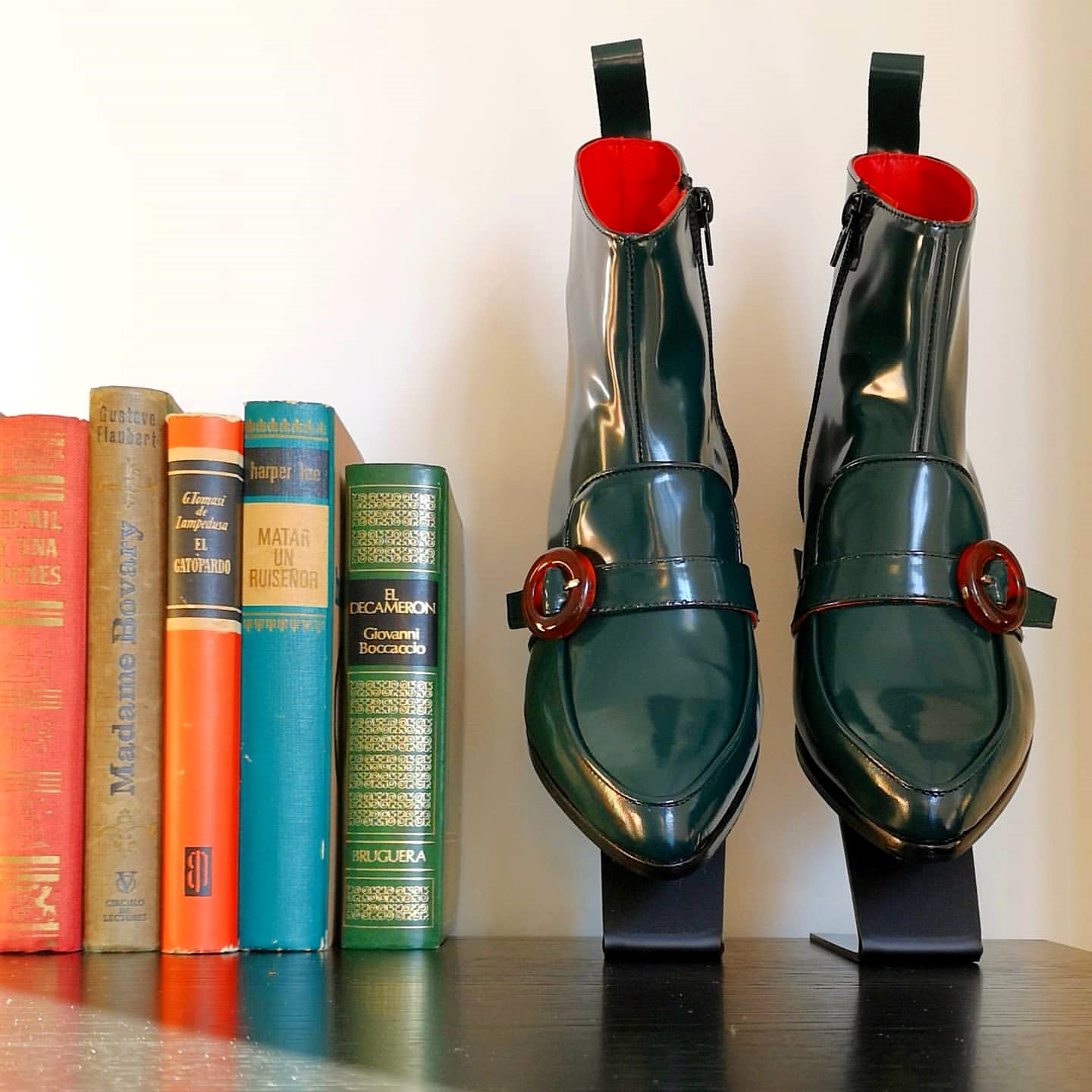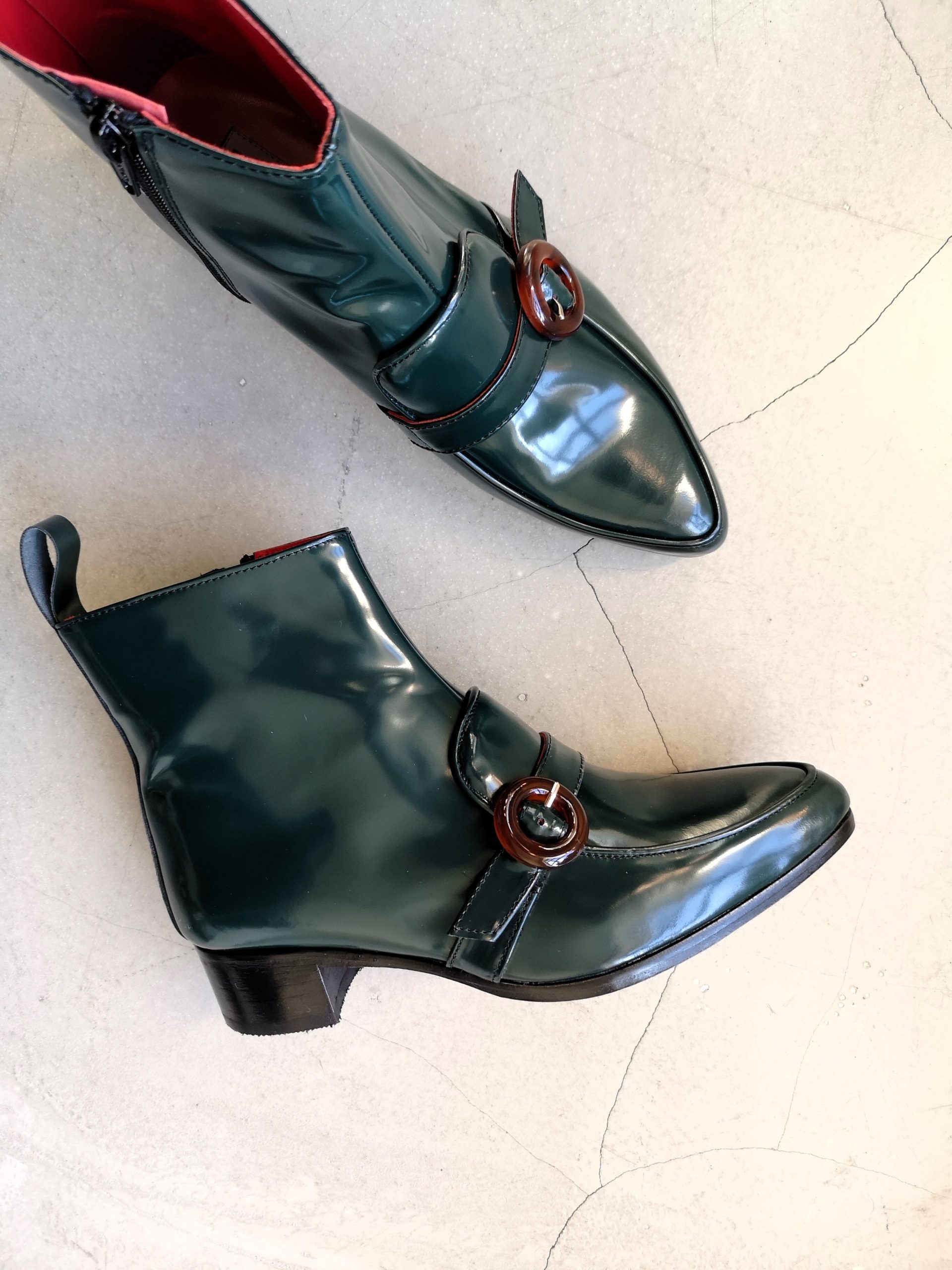 El modelo ISADORA es un botín tipo mocasín con solapa, elaborado artesanalmente en España con piel florentic verde oscuro, que se caracteriza por su cuerpo, resistencia y lustre duraderos. Hebilla estilo carey, regulable para ajustar sujeción a diferentes anchuras. Cierre mediante cremallera lateral, para mayor facilidad de calce.