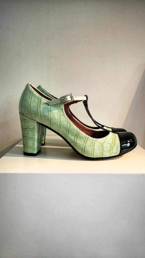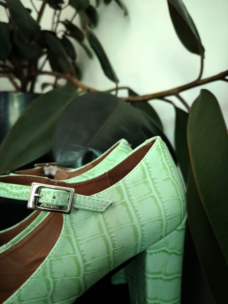El modelo MATCHA está elaborado artesanalmente en España, combinando piel efecto croco en tonos verde matcha y piel acharolada verde oscuro. Super cómodos para aguantar todo el día (y noche!), gracias a la estudiada forma e inclinación de su horma (para mayor comodidad de la espalda), y a su ancho tacón de 7,5 cm altura. Cierre con hebilla plateada y broche regulable.
