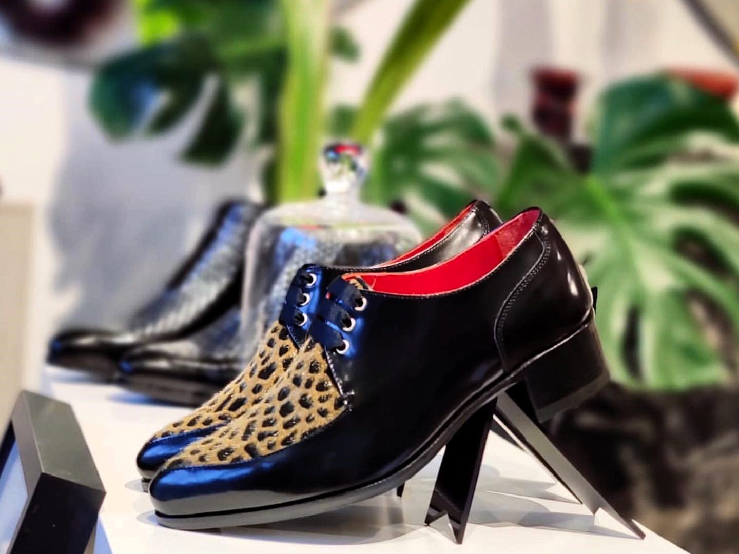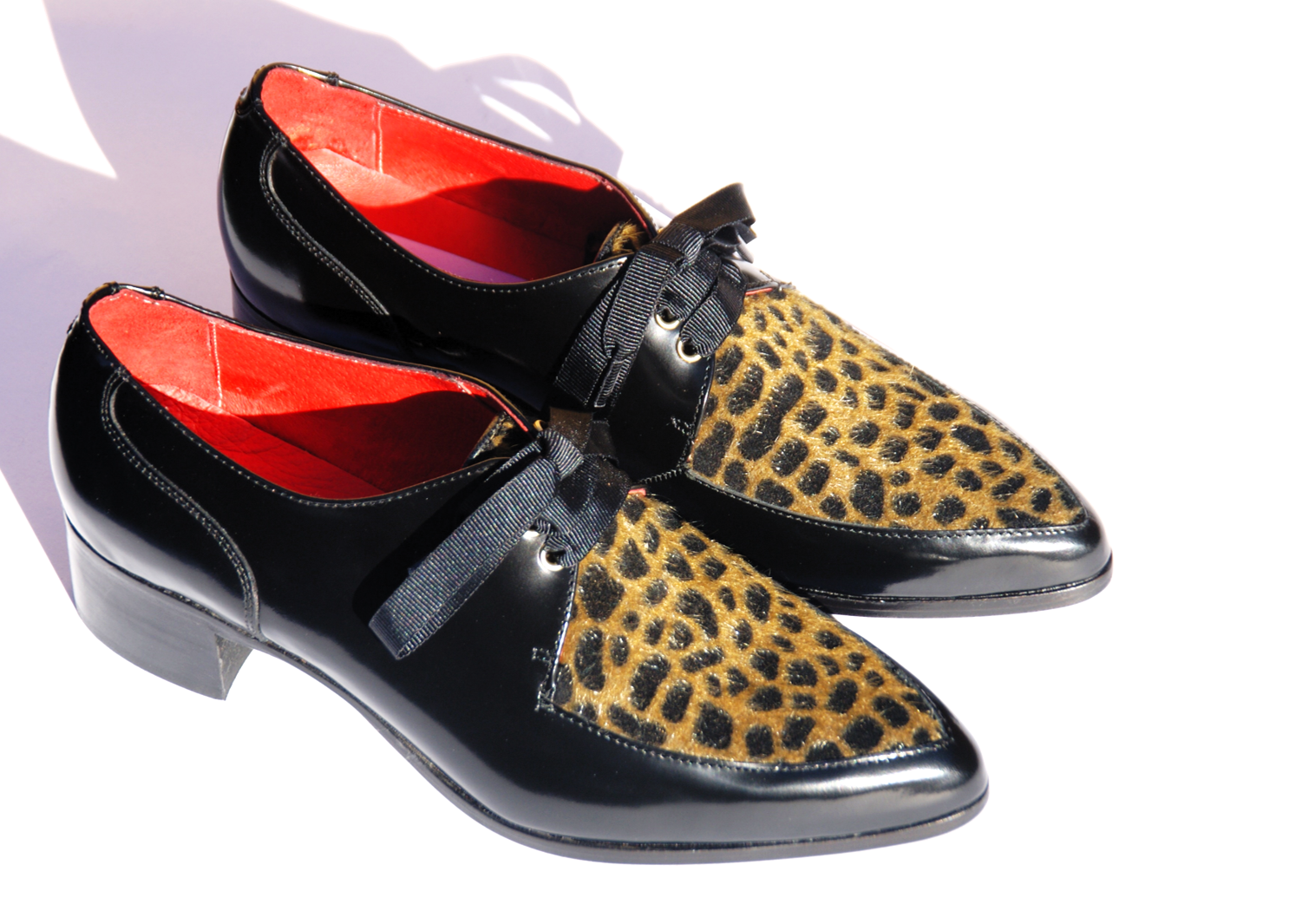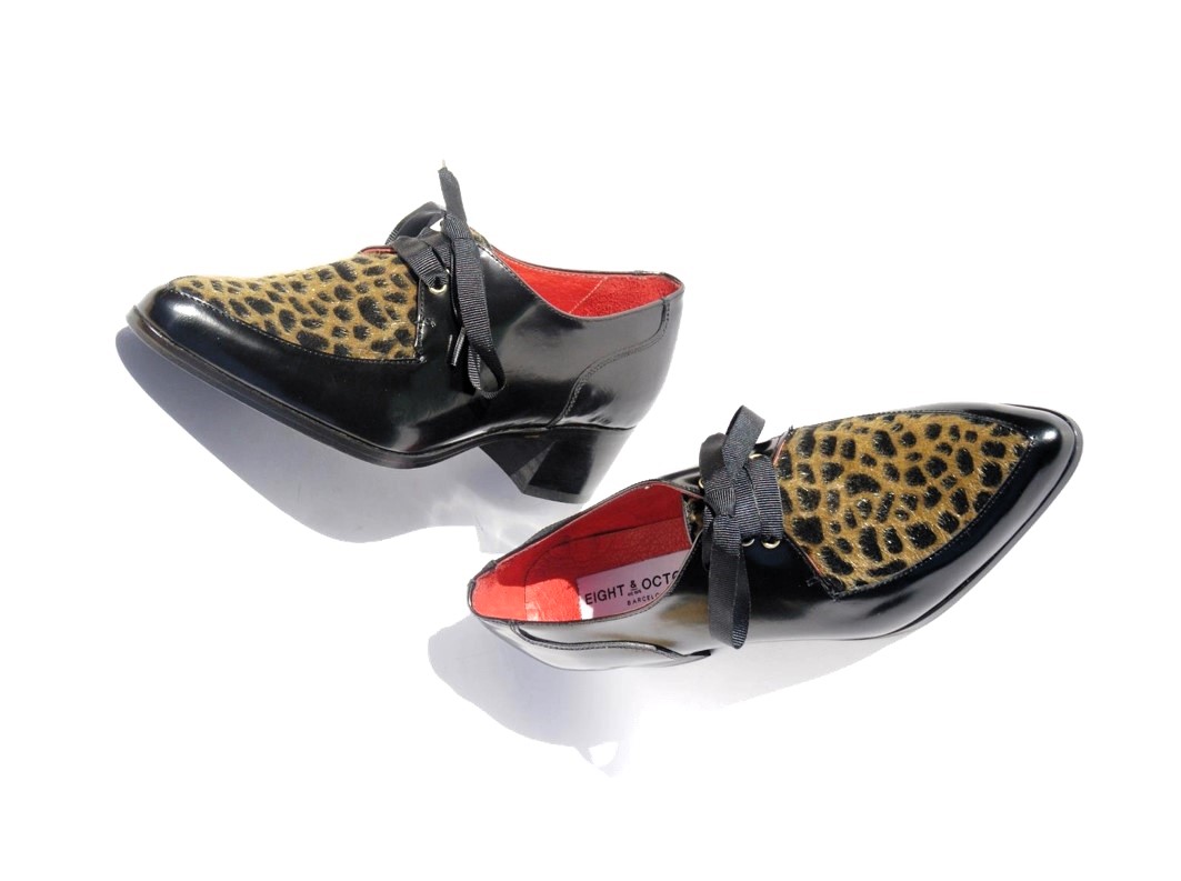 El modelo MILLER está elaborado artesanalmente en España, combinando terciopelo efecto pelo animal print con piel florentic color negro, que se caracteriza por su cuerpo y lustre duraderos. Viene con dos opciones de cierre, para ir usando según se prefiera: cordones negros y lazadas en cinta falla color negro.