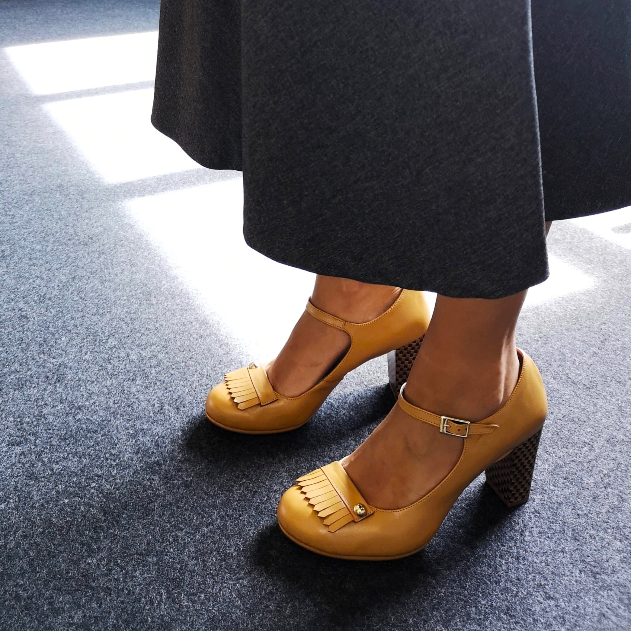 Singular fusión de mercedita y mocasín, el modelo SAFFRON FALL está elaborado artesanalmente en España con una suave piel color amarillo mostaza. Super cómodo para aguantar todo el día (y noche!), gracias a la estudiada forma e inclinación de su horma (para mayor comodidad de la espalda), y a su ancho tacón de 7,5 cm altura. Detalle adorno dorado en empeine. Cierre con hebilla dorada y broche regulable.