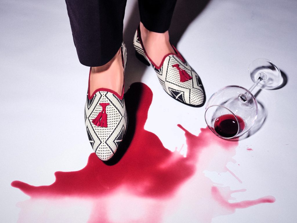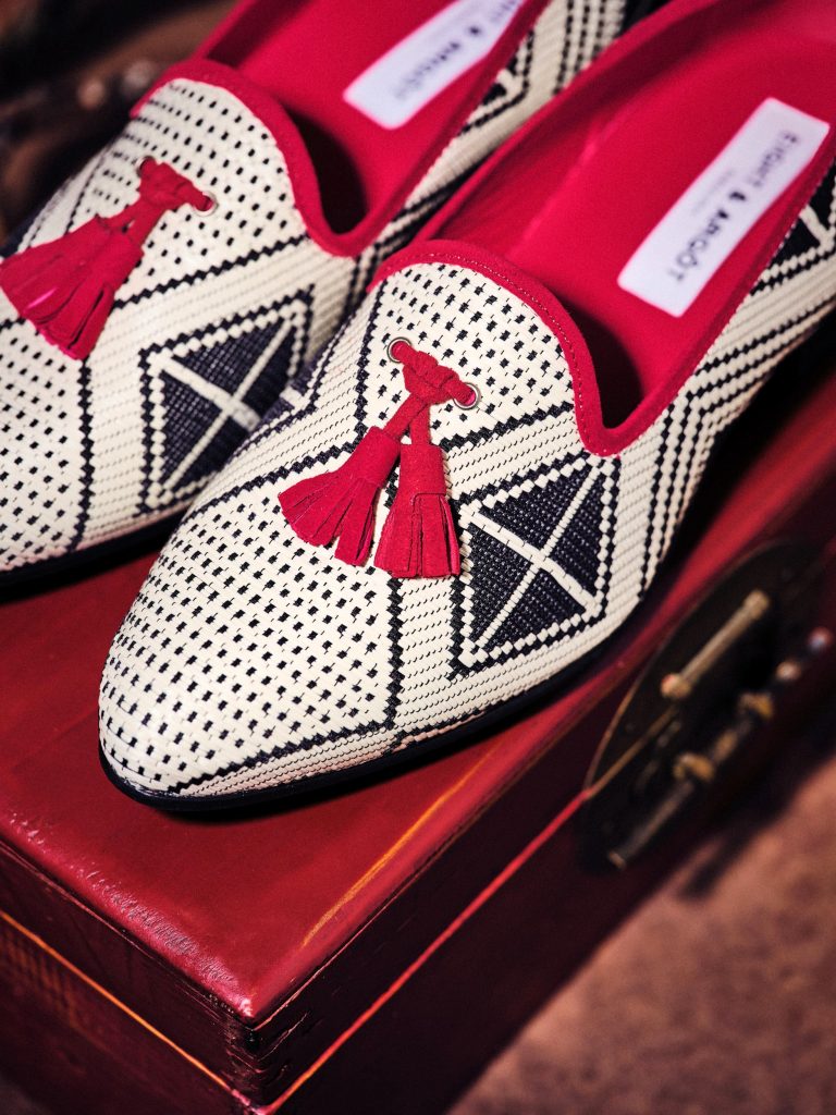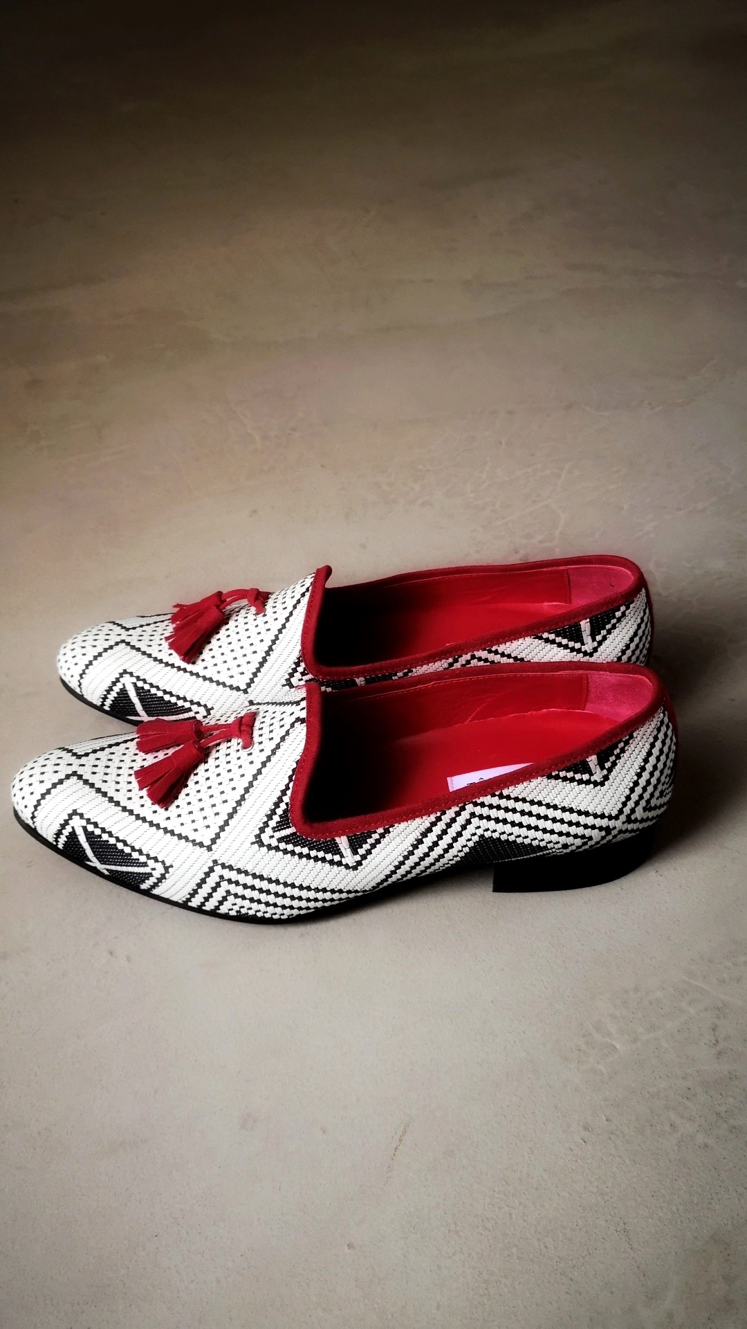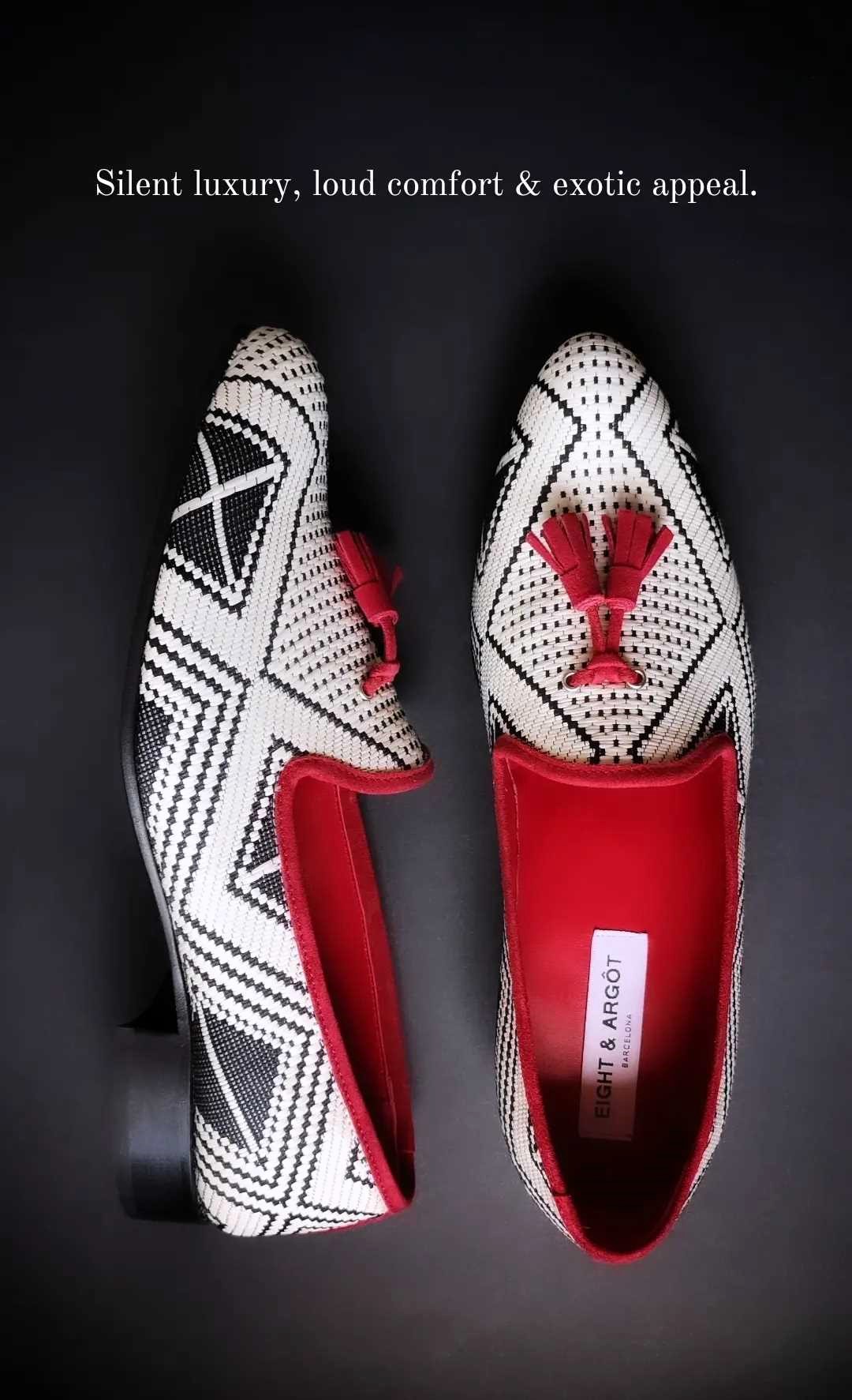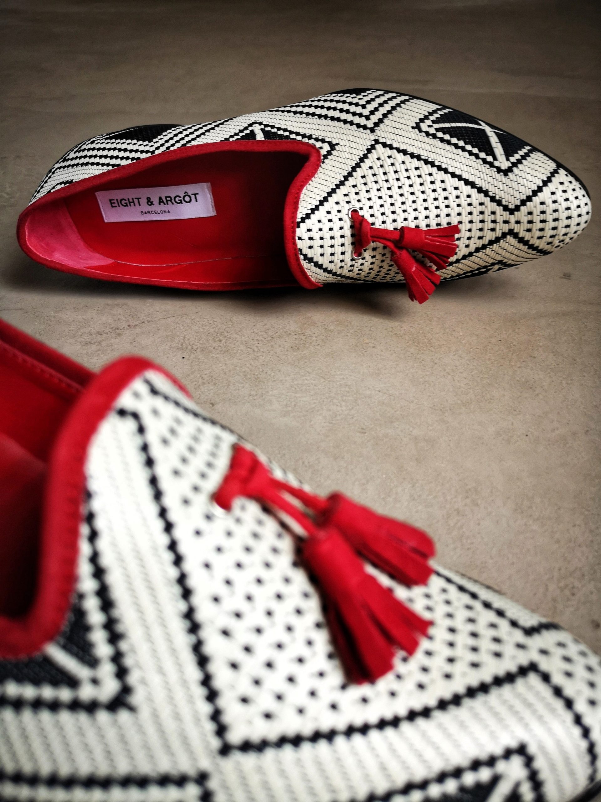 El modelo SAORI está elaborado artesanalmente en España, en una exótica combinación de tejido de rafia sintética con dibujos geométricos, y ante rojo en los vivos y borlas del empeine.