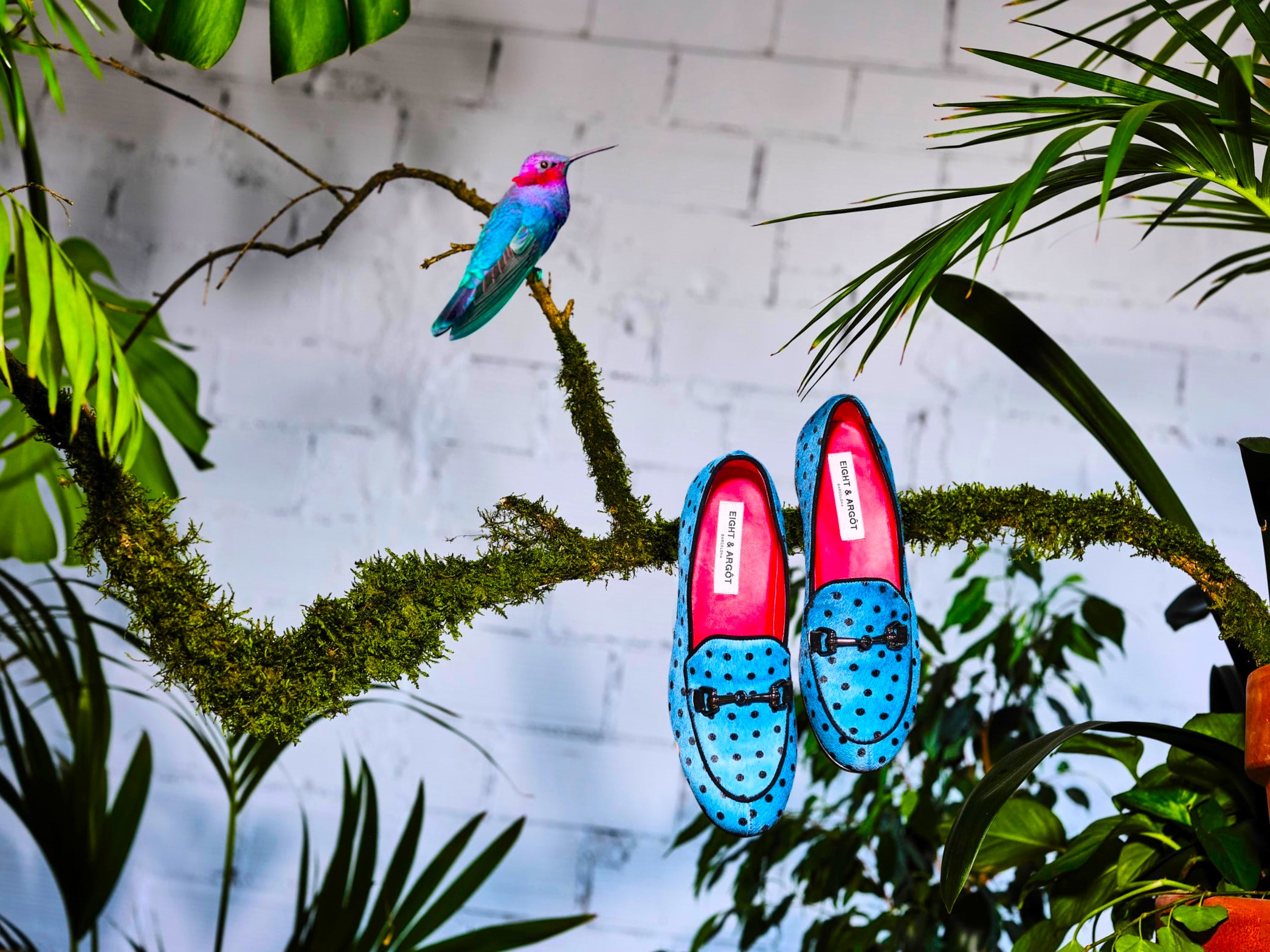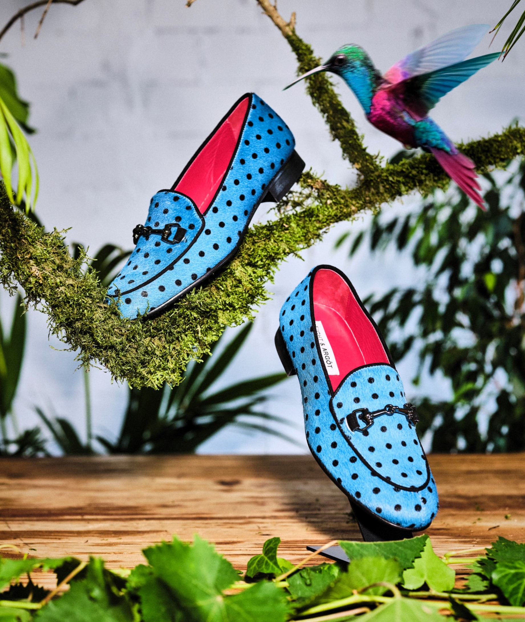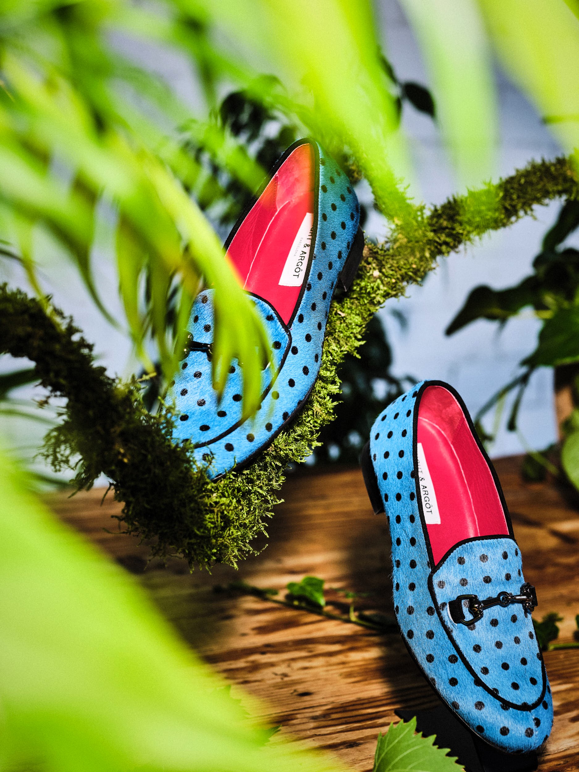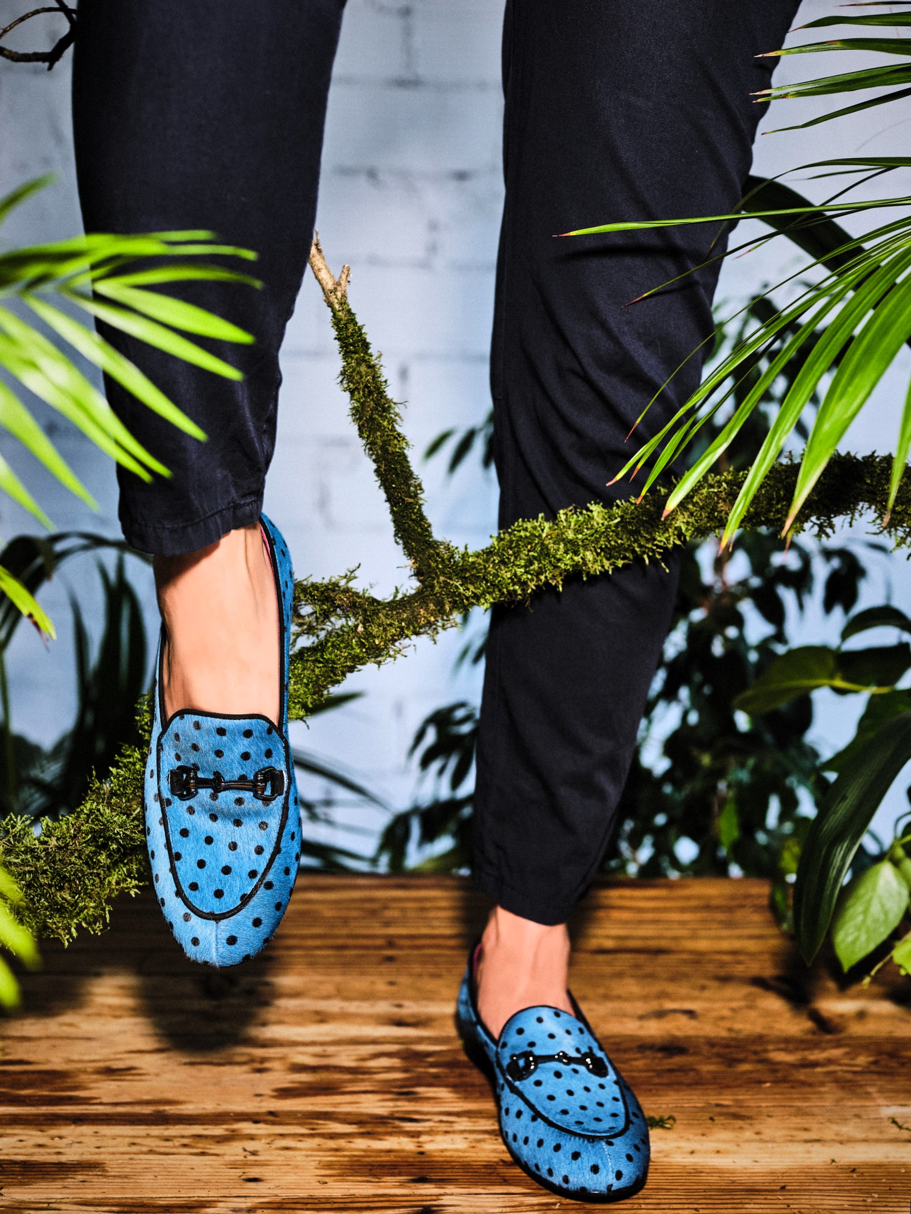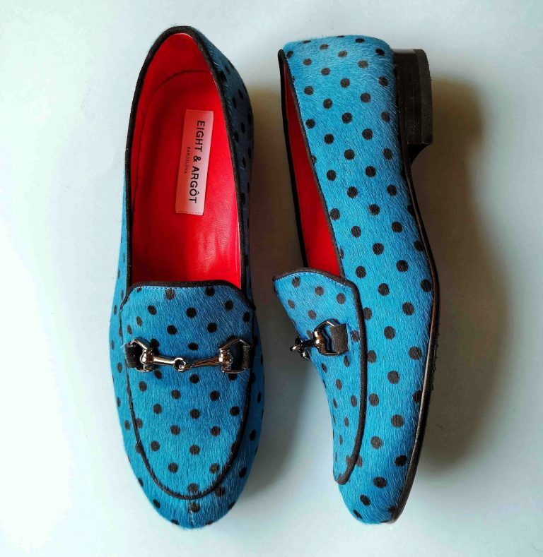 El modelo YNEZ está elaborado artesanalmente en España, en piel de pelo efecto potro tono azul con topitos negros. Detalle de hebilla metalizada negra en empeine.